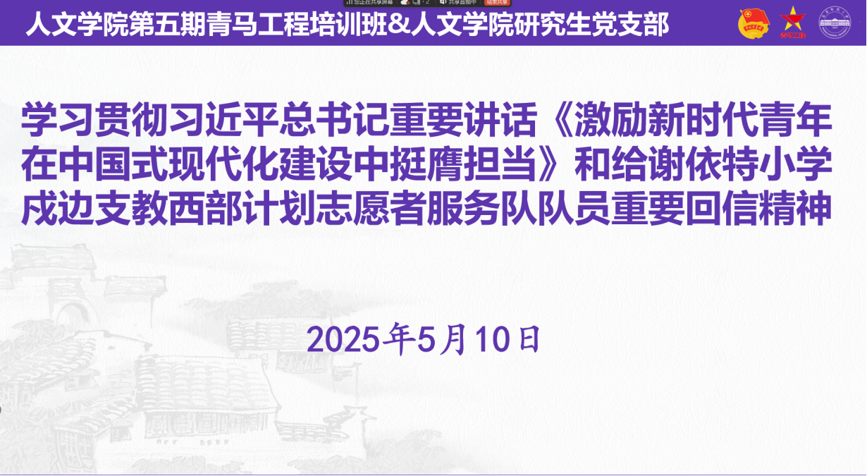 5月10日,伟德国际1946源于英国研究生党支部与第五期青马工程培训班举行线上会议,学习贯彻习近平总书记给谢依特小学戍边支教西部计划志愿者服务队队员重要回信精神,并邀请2021年西部计划志愿者、2024级学科教学(历史)专业程添星同学进行经验分享。