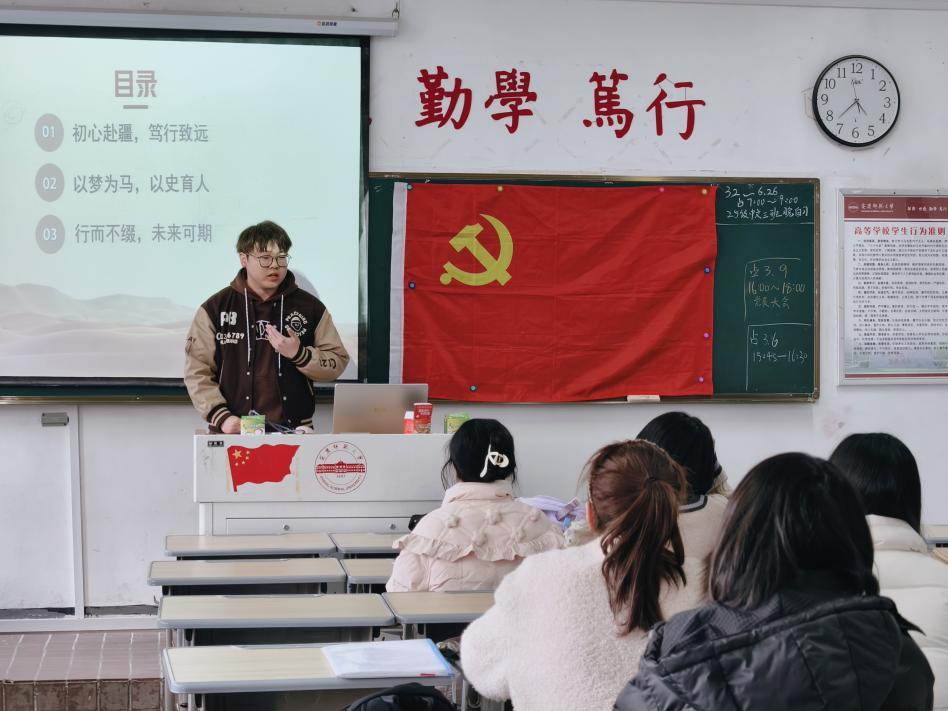 活动伊始,余庆明同学以“初心赴疆,笃行致远”为题,分享了他在援疆支教过程中的个人成长与教学体悟。面对从学生到教师身份转变的适应难题、地理环境带来的挑战,余庆明始终坚守“以梦为马,以史育人”的初心,立足八年级历史教学,他努力将“文化润疆”融入课堂;在课后服务中,他用小奖励撬动大热情,拉近与学生的距离。第一次公开课、第一次教研活动……余庆明用一个个鲜活的故事,展现了青年学子在边疆一线教育实践的历练与蜕变。