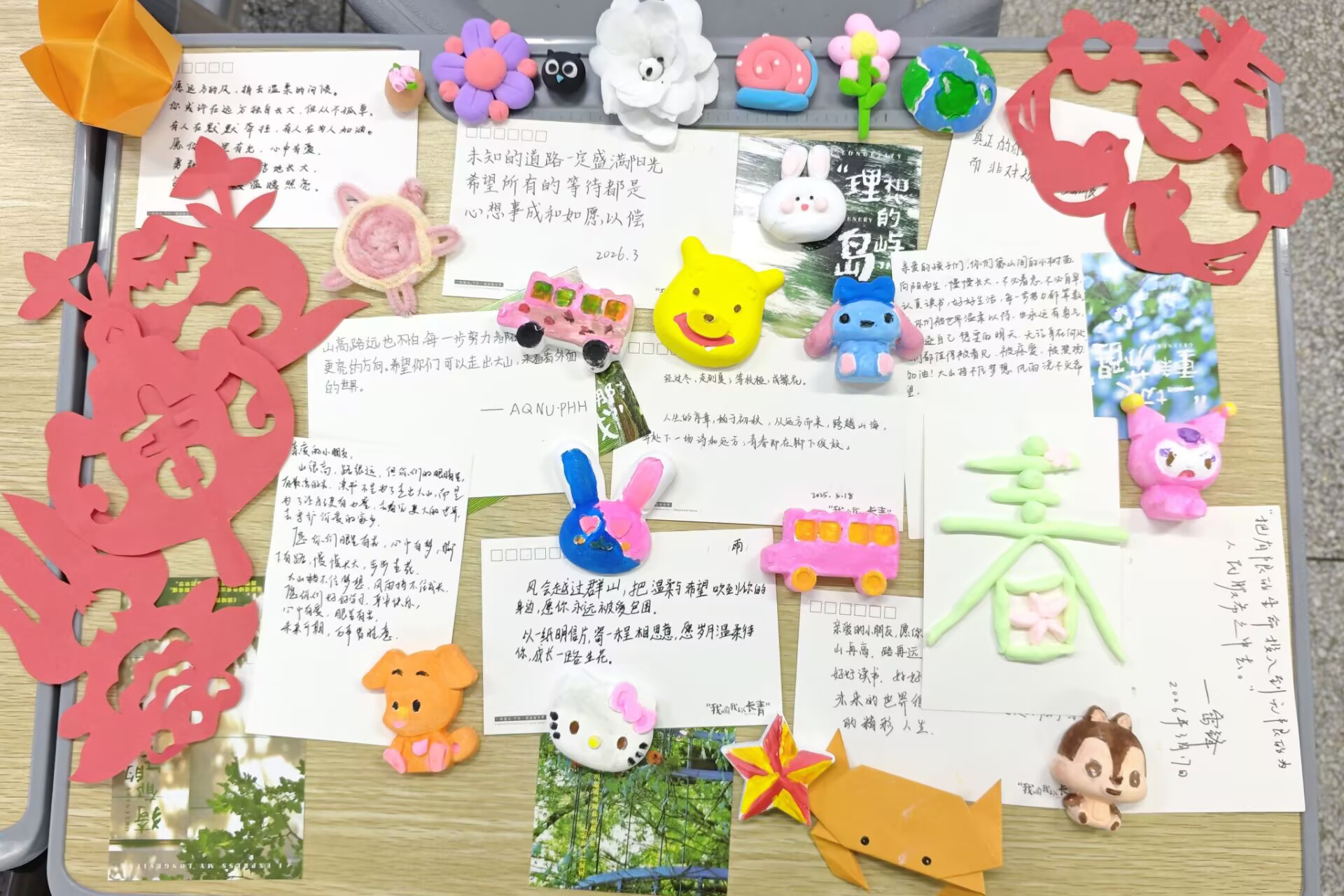 线下活动现场暖意融融,两校区同步开展手工制作与书信撰写。参与学子围坐一堂,以彩纸、黏土、画笔为媒,用心勾勒、精心创作,将真挚祝福融入每一件作品。大家认真书写书信与明信片,既有致敬雷锋的经典名言,也有温情满满的鼓励话语,字里行间满是牵挂与期许。灵动可爱的黏土作品、精巧别致的折纸贺卡,承载着浓浓爱意,成为连接校园与山区儿童的温暖纽带。同学们在实践中感悟雷锋精神,以实际行动践行“奉献、友爱、互助、进步” 的志愿精神,现场洋溢着青春正能量。