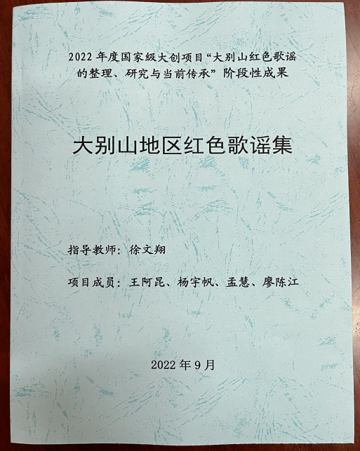 近日,伟德国际1946源于英国2020级汉语言文学专业王阿昆、杨宇帆、孟慧、廖陈江等四名同学在徐文翔老师指导下,整理完成《大别山地区红色歌谣集》。作为2022年度国家级大创项目“大别山红色歌谣的整理、研究与当前传承”的阶段性成果,《大别山地区红色歌谣集》共收录土地革命战争时期到解放战争时期的大别山地区红色歌谣230余首,是目前为止最为完备的同类歌谣辑录。这些红色歌谣体现了大别山地区的革命精神,是大别山红色文化的重要组成部分,对当前大别山红色文化的传承有重要的参考价值。