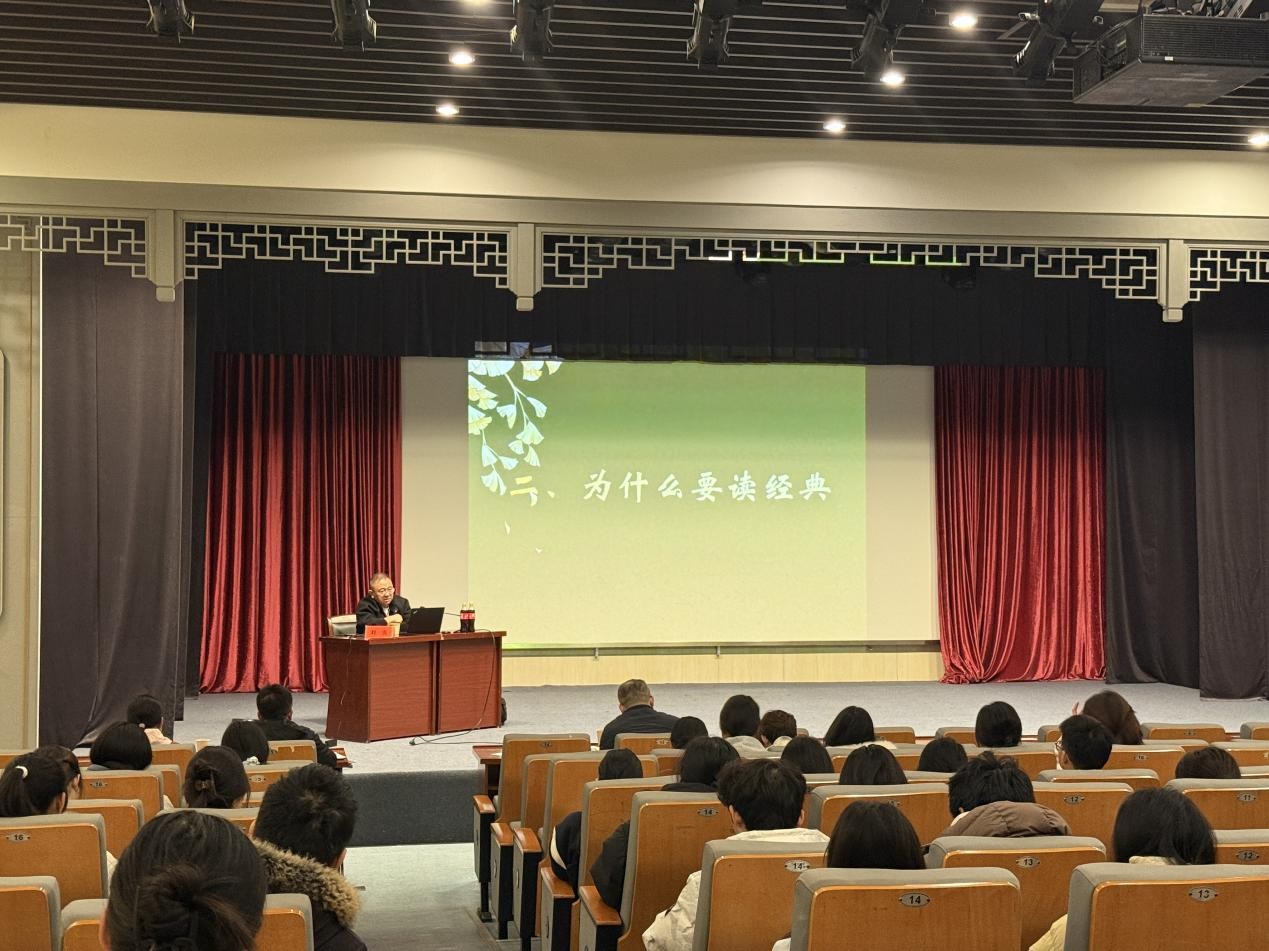 刘勇教授围绕什么是经典、为什么要读经典、如何读经典展开阐释。他指出AI时代阅读经典文学的重要性,强调经典文学能提供深刻的人生哲理,帮助个人在快速变化的时代保持内心的平和与稳定。为让听众直观感受经典的魅力,刘教授以鲁迅、余华、孙犁等文学大家的作品为例,进行深度剖析,阐述了文学作品的复杂性和多维度解读,鼓励读者根据个人经历探索作品。谈及“如何读经典”,刘教授提出“心读”的核心方法。他认为,经典阅读应沉下心来品味文字背后的深意,同时注重将阅读体验与个人生命体悟相融合,让经典真正内化为自身的智慧与素养。现场师生就阅读选择、读书方法等问题进行深入交流,氛围热烈。