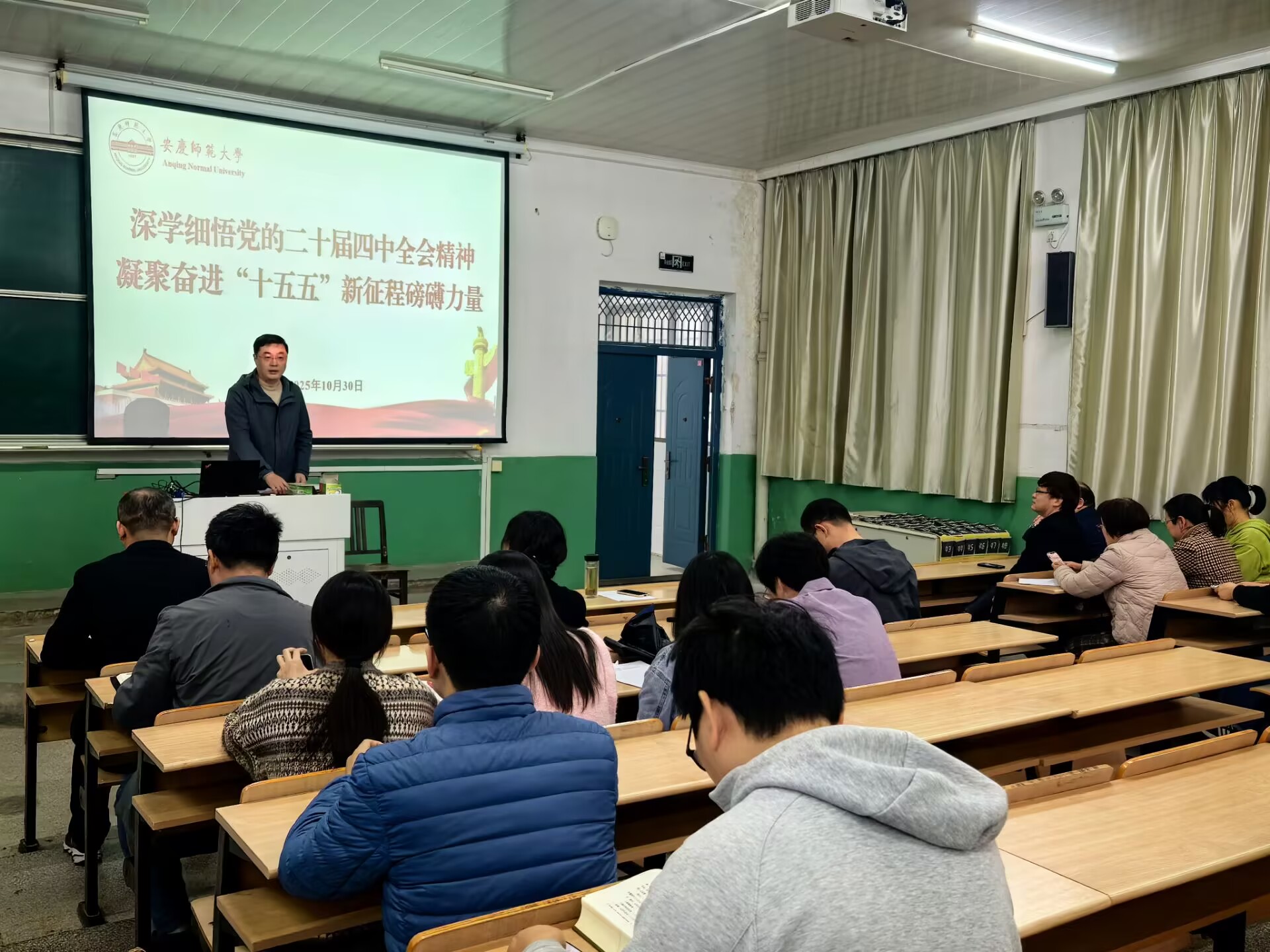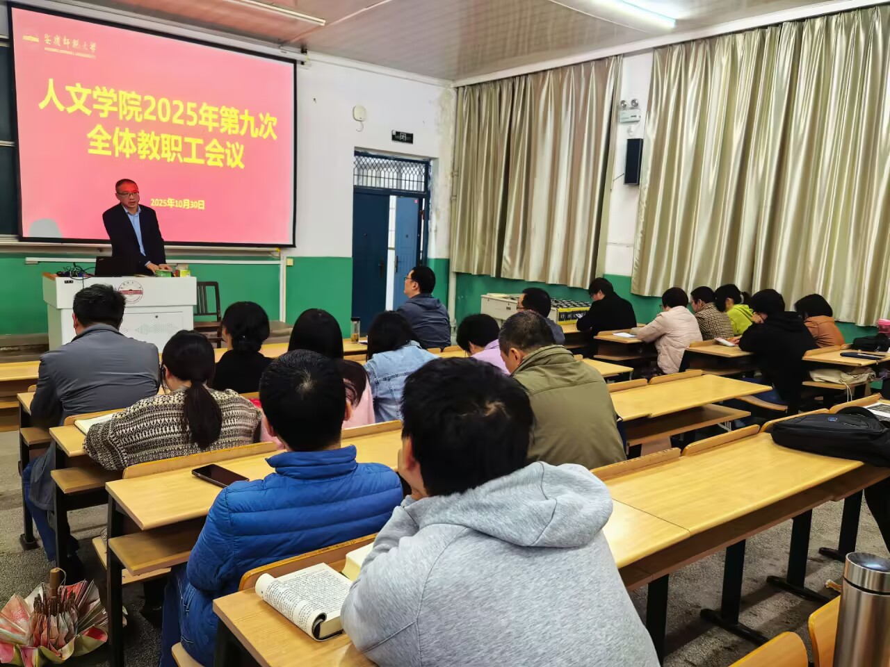 10月30日,伟德国际1946源于英国召开2025年第九次全体教职工会议,开展党的二十届四中全会精神宣讲并部署近期重点工作。学院领导班子及全体教职工参加会议,院长汪孔丰主持会议。党委书记王波以“深学四中全会精神 奋进‘十五五’新征程”为主题做了党的二十届四中全会精神宣讲。